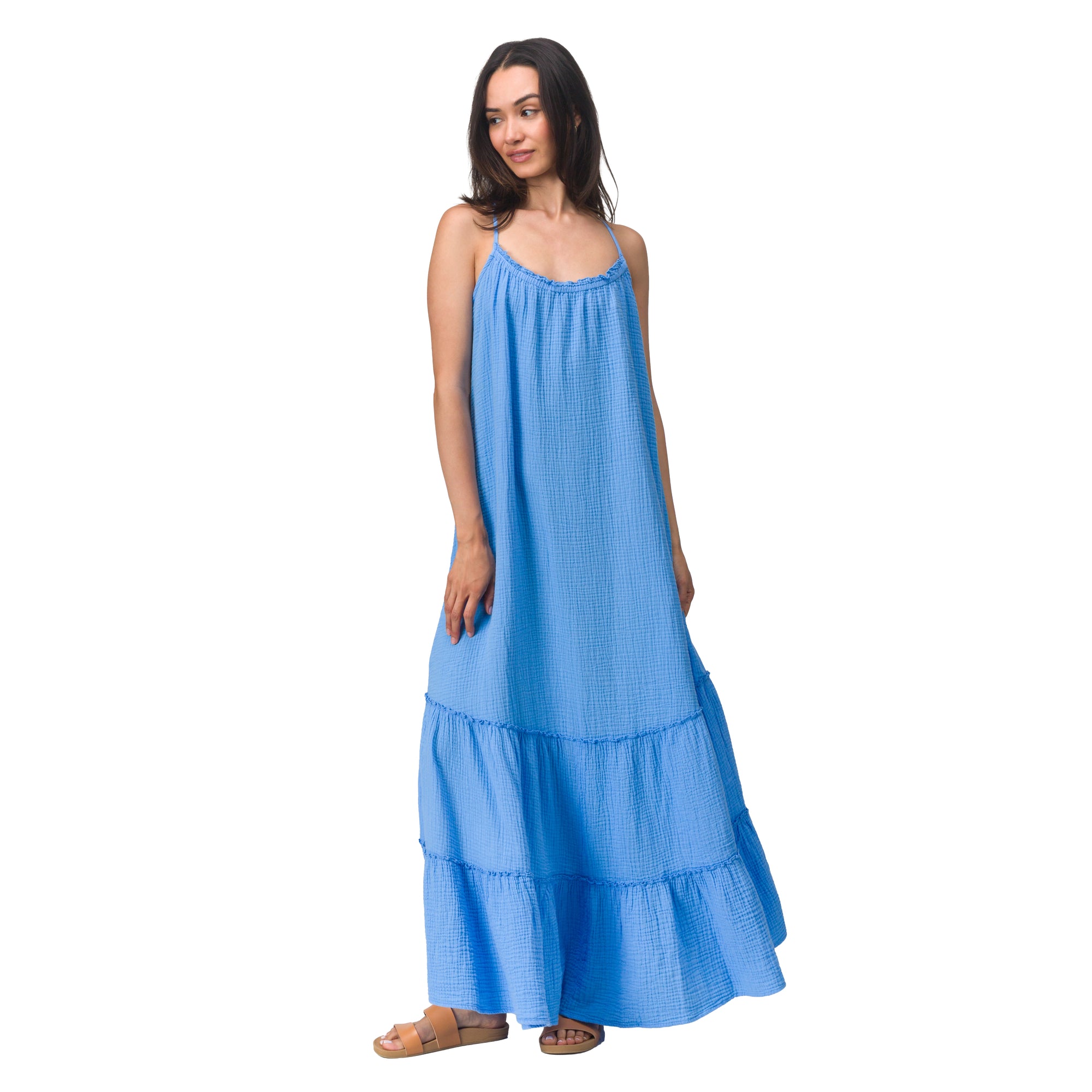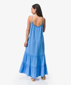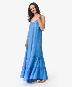 Light, flowy, and made for warm, easy days, the Lainey Maxi Dress delivers effortless style with a soft, relaxed feel. Crafted from lightweight double gauze woven cotton, it offers breathable comfort and a gently textured hand that moves beautifully with you. The relaxed tent silhouette drapes effortlessly, while adjustable shoulder straps and a low back with elastic ruffle detail create a flattering, easy fit.